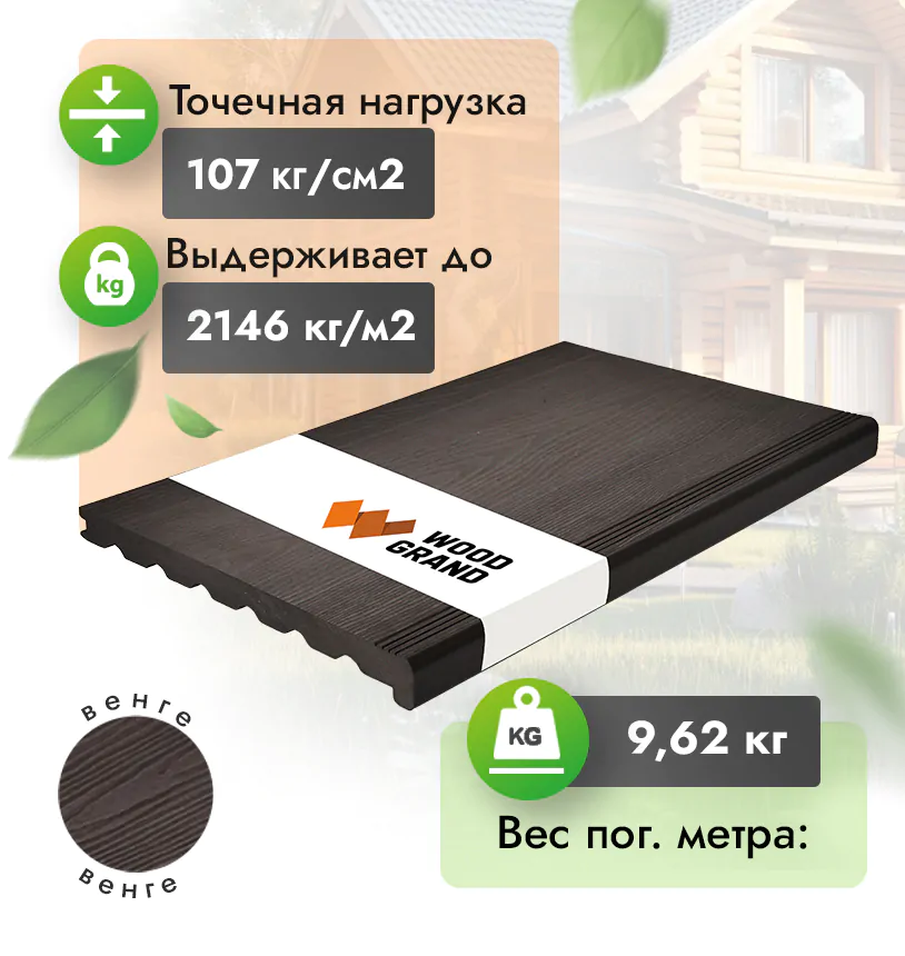 Наши ступени из ДПК выдерживают до 3318 кг/м2, влагостойкие, не требуют ухода.